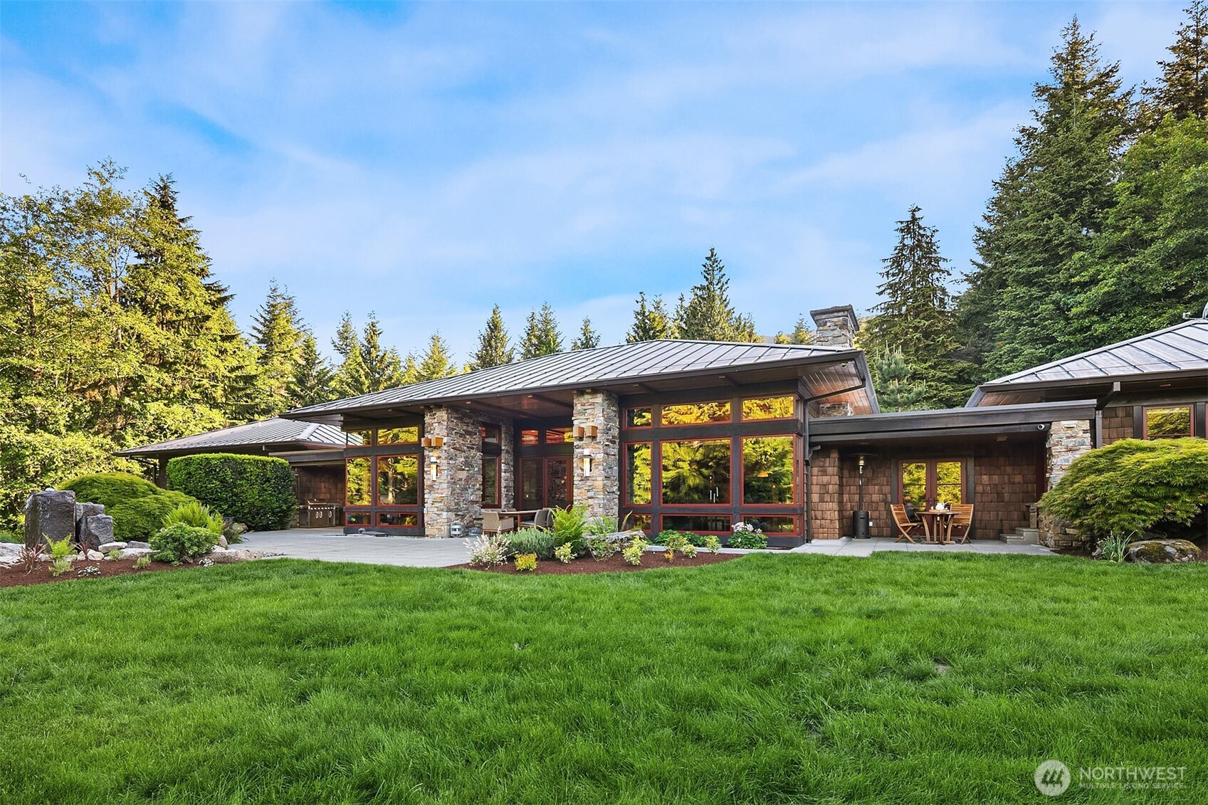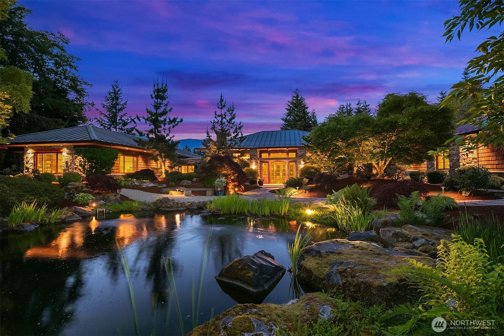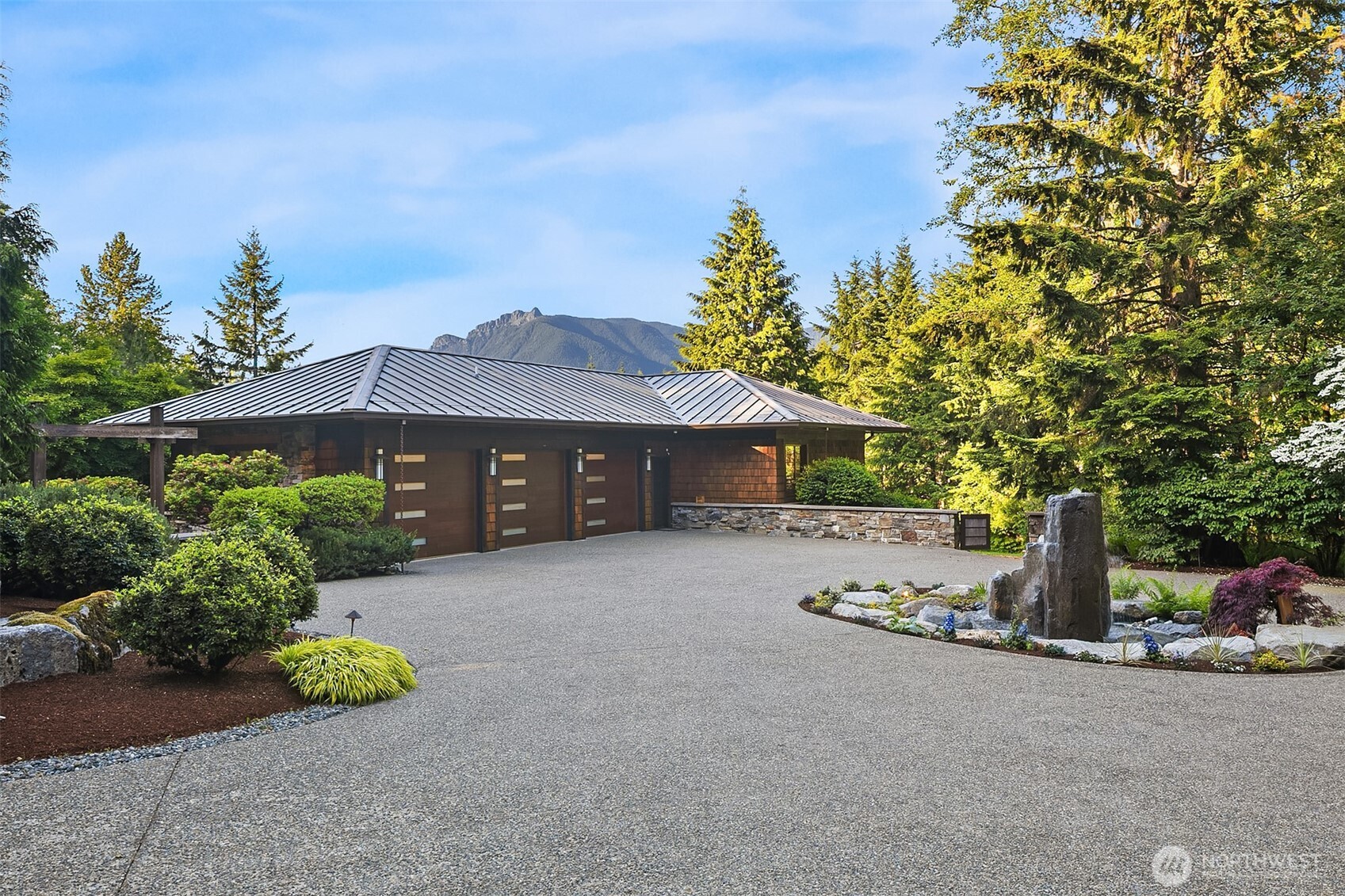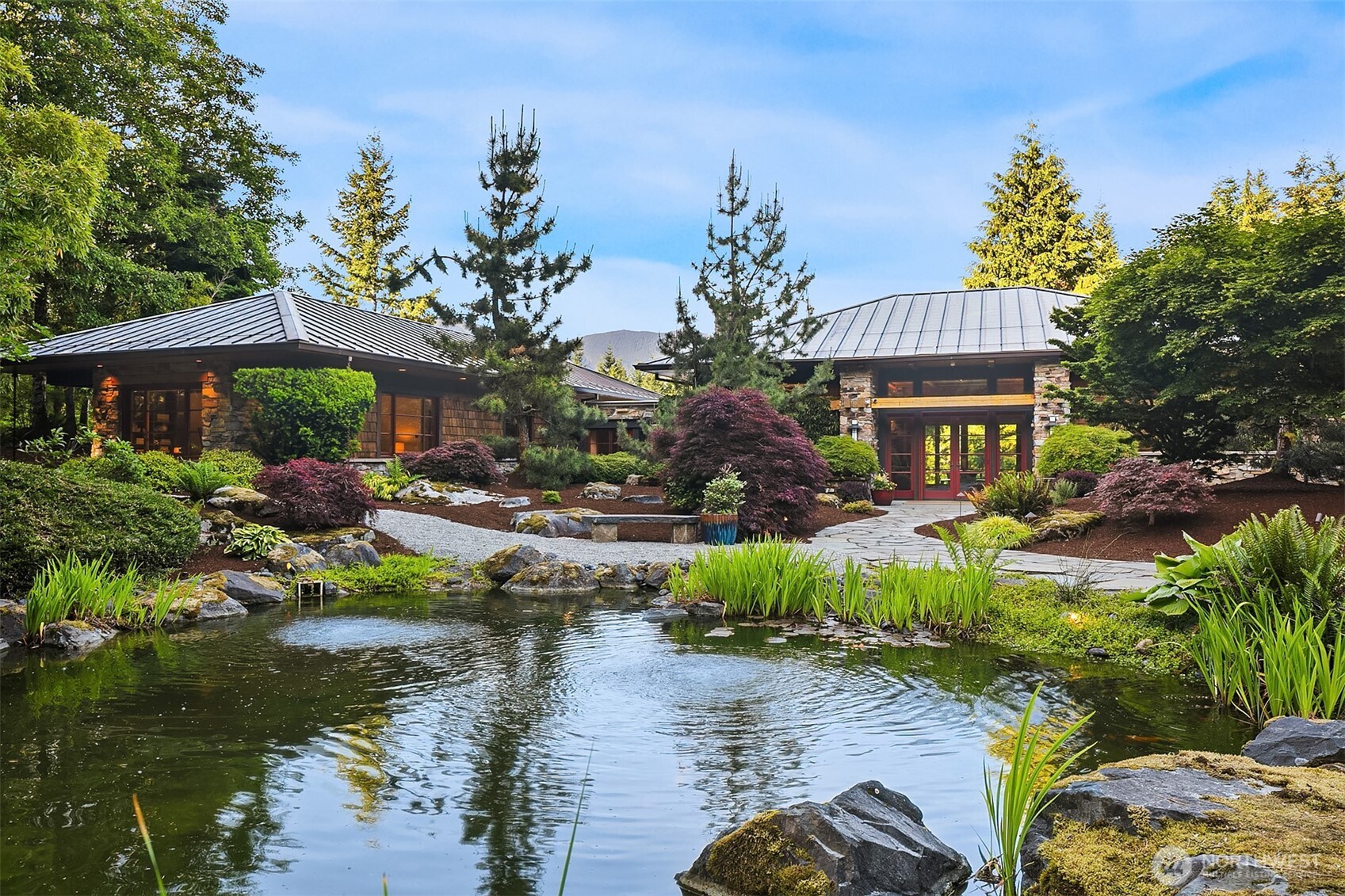 Award-winning 2002 MAME "Best Custom Home", inspired by Frank Lloyd Wright's iconic Falling Water, featuring PNW and Japanese influences. Stress melts with the sound of the waterfall. Enjoy feeding koi in a seasonal symphony of color landscaping. A temple awaits as you open the front doors with symmetrically balanced stone, wood, and glass. Awake with the sun and views of Mt Si, drift to sleep with the sounds of the water splashing. The primary spa awaits to nurture your tired body further. Take refuge in the cozy home theater with a 17' wide screen and soundproof walls. Whether feeding 4 or 40, the U-shaped kitchen layout is perfect for orchestrating meals, including guests for conversation or prep, but keeping them out of your domain.
