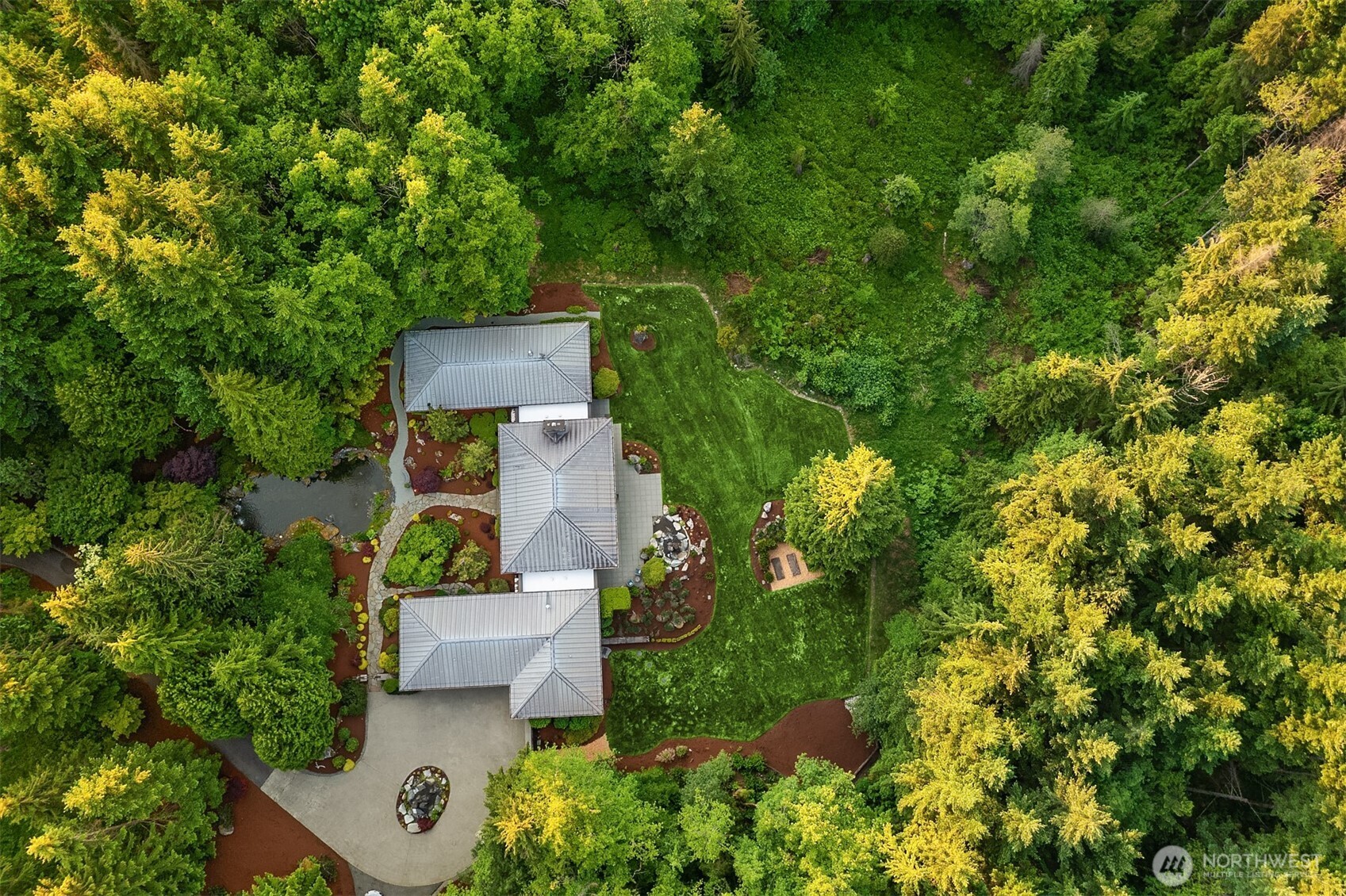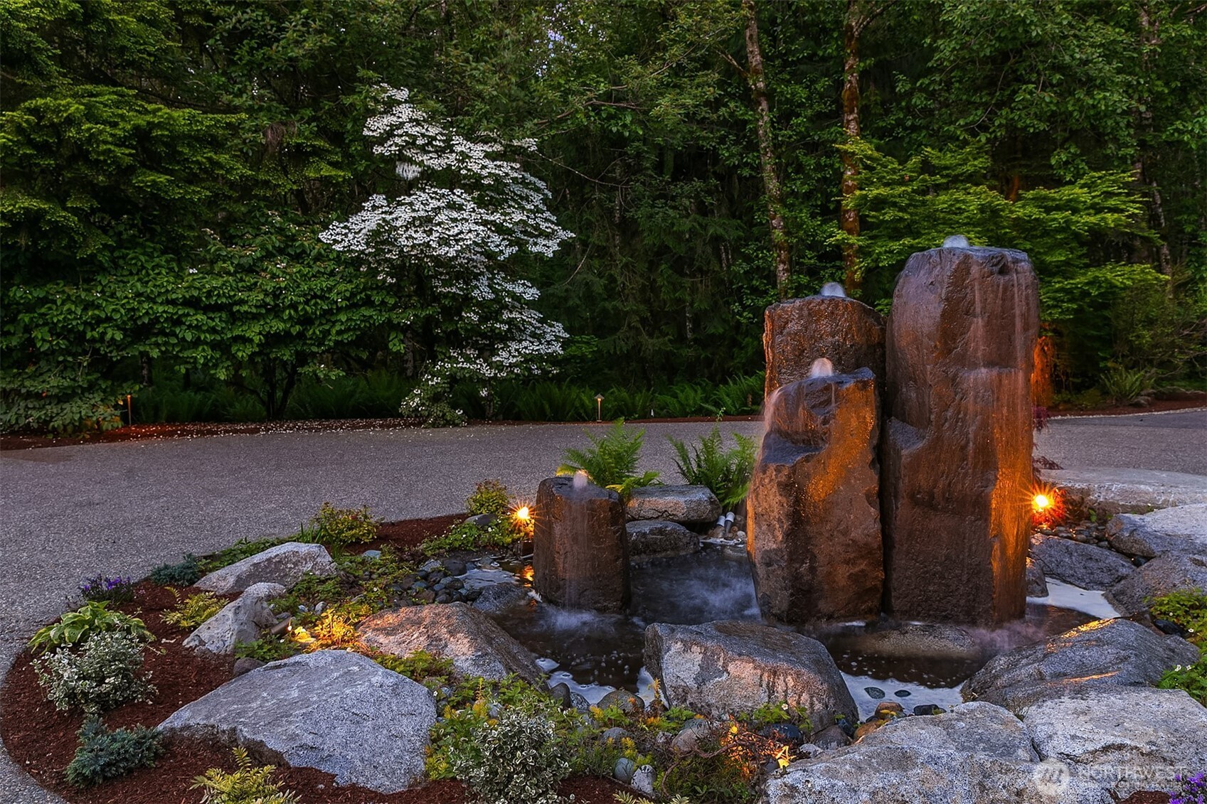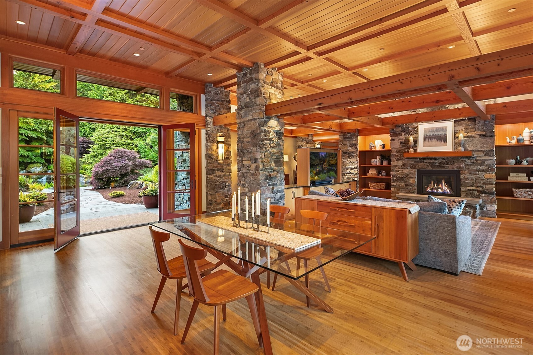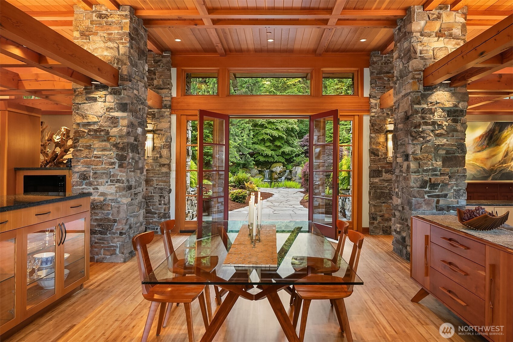 Award-winning 2002 MAME "Best Custom Home", inspired by Frank Lloyd Wright's iconic Falling Water, featuring PNW and Japanese influences. Stress melts with the sound of the waterfall. Enjoy feeding koi in a seasonal symphony of color landscaping. A temple awaits as you open the front doors with symmetrically balanced stone, wood, and glass. Awake with the sun and views of Mt Si, drift to sleep with the sounds of the water splashing. The primary spa awaits to nurture your tired body further. Take refuge in the cozy home theater with a 17' wide screen and soundproof walls. Whether feeding 4 or 40, the U-shaped kitchen layout is perfect for orchestrating meals, including guests for conversation or prep, but keeping them out of your domain.