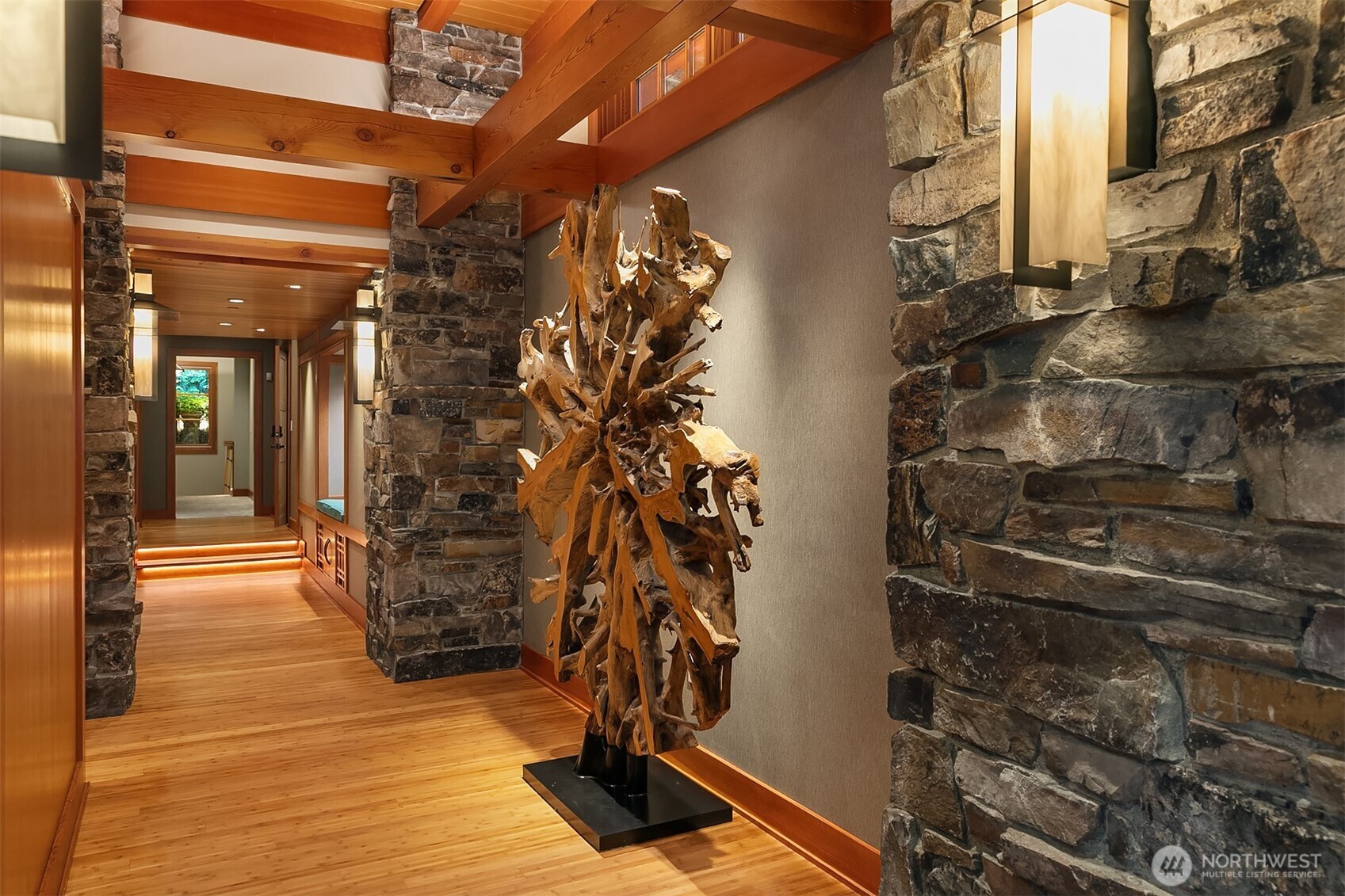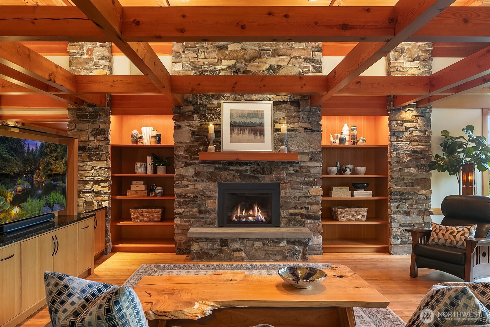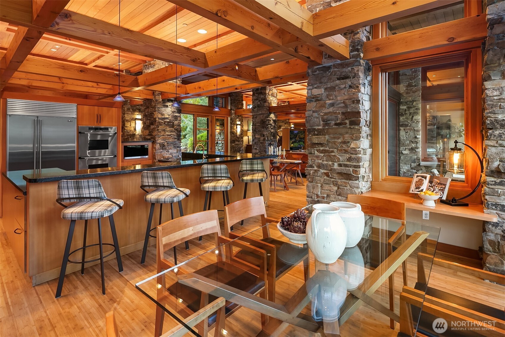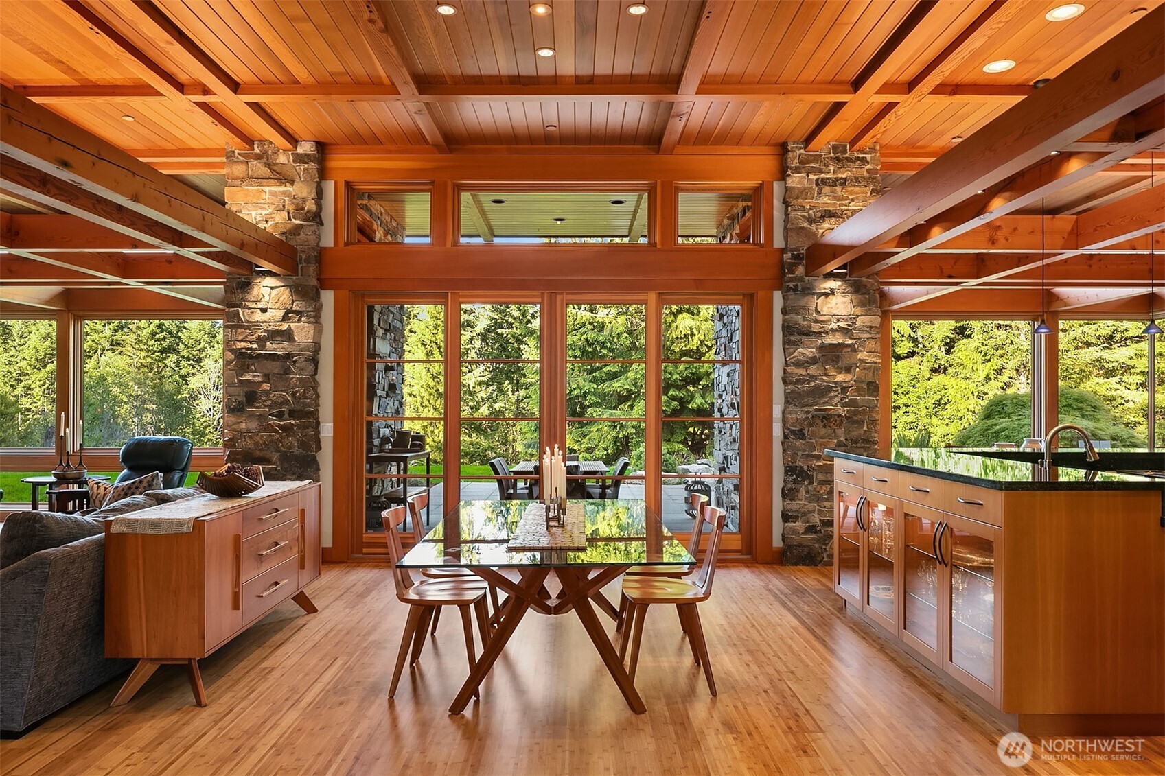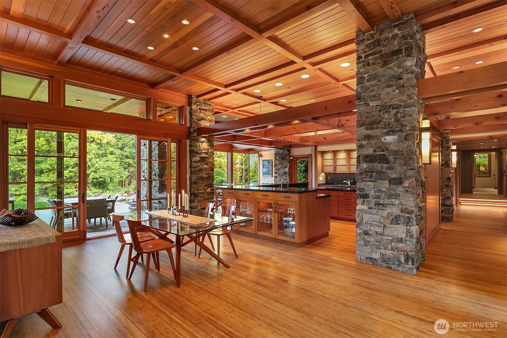Award-winning 2002 MAME "Best Custom Home", inspired by Frank Lloyd Wright's iconic Falling Water, featuring PNW and Japanese influences. Stress melts with the sound of the waterfall. Enjoy feeding koi in a seasonal symphony of color landscaping. A temple awaits as you open the front doors with symmetrically balanced stone, wood, and glass. Awake with the sun and views of Mt Si, drift to sleep with the sounds of the water splashing. The primary spa awaits to nurture your tired body further. Take refuge in the cozy home theater with a 17' wide screen and soundproof walls. Whether feeding 4 or 40, the U-shaped kitchen layout is perfect for orchestrating meals, including guests for conversation or prep, but keeping them out of your domain.